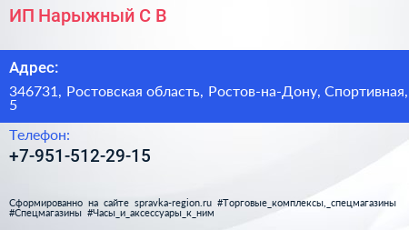 ИП Нарыжный С.В. по адресу 346731, Ростовская область, Ростов-на-Дону, Спортивная, 5 в дальнейшем Организация, размещена в следующих категориях: