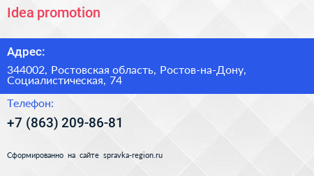 Idea-promotion по адресу 344002, Ростовская область, Ростов-на-Дону, Социалистическая, 74 в дальнейшем Организация, размещена в следующих категориях: