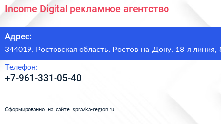 Income Digital, рекламное агентство по адресу 344019, Ростовская область, Ростов-на-Дону, 18-я линия, 8 в дальнейшем Организация, размещена в следующих категориях: