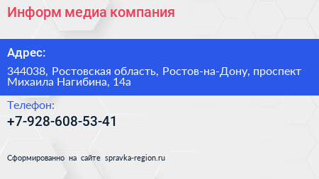 Информ медиа, компания по адресу 344038, Ростовская область, Ростов-на-Дону, проспект Михаила Нагибина, 14а в дальнейшем Организация, размещена в следующих категориях: