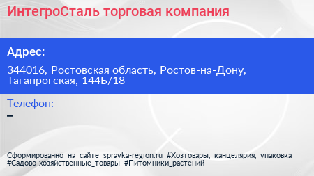 ИнтегроСталь, торговая компания по адресу 344016, Ростовская область, Ростов-на-Дону, Таганрогская, 144Б/18 в дальнейшем Организация, размещена в следующих категориях: