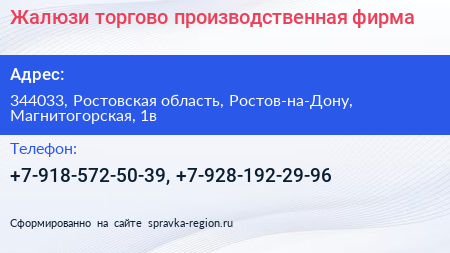 Жалюзи, торгово-производственная фирма по адресу 344033, Ростовская область, Ростов-на-Дону, Магнитогорская, 1в в дальнейшем Организация, размещена в следующих категориях: