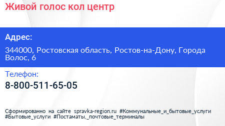 Живой голос, кол-центр по адресу 344000, Ростовская область, Ростов-на-Дону, Города Волос, 6 в дальнейшем Организация, размещена в следующих категориях: