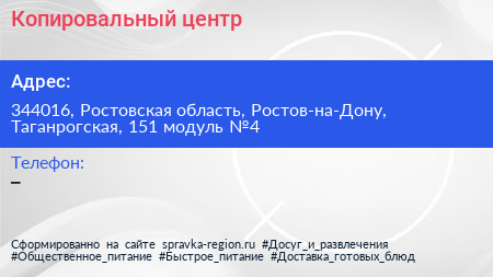 Копировальный центр по адресу 344016, Ростовская область, Ростов-на-Дону, Таганрогская, 151 модуль №4 в дальнейшем Организация, размещена в следующих категориях: