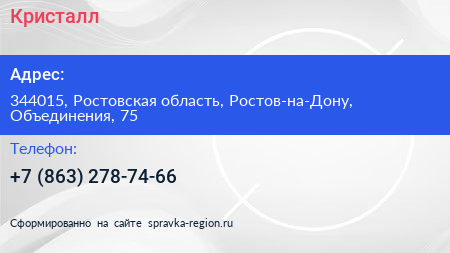 Кристалл по адресу 344015, Ростовская область, Ростов-на-Дону, Объединения, 75 в дальнейшем Организация, размещена в следующих категориях: