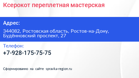Ксерокот, переплетная мастерская по адресу 344082, Ростовская область, Ростов-на-Дону, Будённовский проспект, 27 в дальнейшем Организация, размещена в следующих категориях: