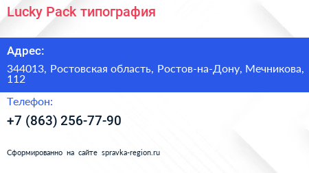 Lucky Pack, типография по адресу 344013, Ростовская область, Ростов-на-Дону, Мечникова, 112 в дальнейшем Организация, размещена в следующих категориях: