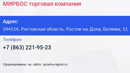 МИРБОС, торговая компания по адресу 344114, Ростовская область, Ростов-на-Дону, Беляева, 11 в дальнейшем Организация, размещена в следующих категориях: