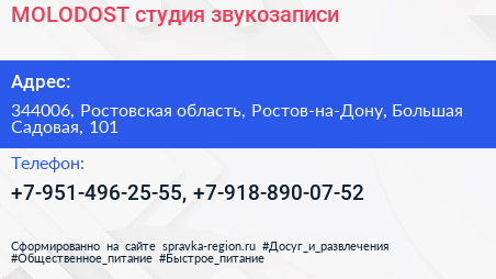 MOLODOST, студия звукозаписи по адресу 344006, Ростовская область, Ростов-на-Дону, Большая Садовая, 101 в дальнейшем Организация, размещена в следующих категориях: