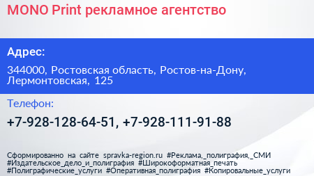 MONO Print, рекламное агентство по адресу 344000, Ростовская область, Ростов-на-Дону, Лермонтовская, 125 в дальнейшем Организация, размещена в следующих категориях: