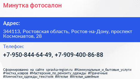 Минутка, фотосалон по адресу 344113, Ростовская область, Ростов-на-Дону, проспект Космонавтов, 28 в дальнейшем Организация, размещена в следующих категориях: