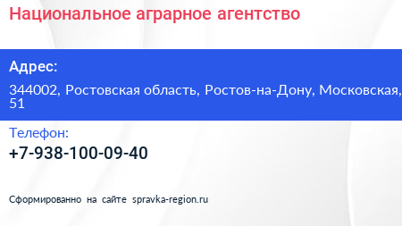 Национальное аграрное агентство по адресу 344002, Ростовская область, Ростов-на-Дону, Московская, 51 в дальнейшем Организация, размещена в следующих категориях: