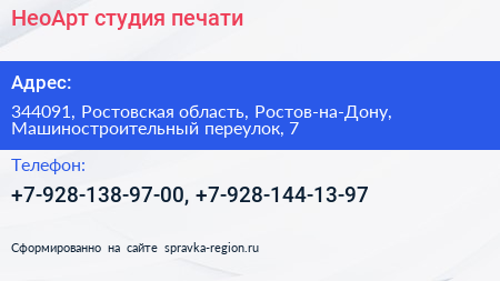 НеоАрт, студия печати по адресу 344091, Ростовская область, Ростов-на-Дону, Машиностроительный переулок, 7 в дальнейшем Организация, размещена в следующих категориях: