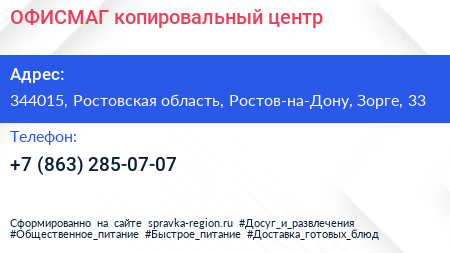 ОФИСМАГ, копировальный центр по адресу 344015, Ростовская область, Ростов-на-Дону, Зорге, 33 в дальнейшем Организация, размещена в следующих категориях: