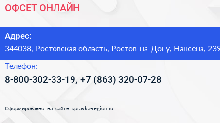 ОФСЕТ ОНЛАЙН по адресу 344038, Ростовская область, Ростов-на-Дону, Нансена, 239 в дальнейшем Организация, размещена в следующих категориях: