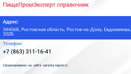 ПищеПромЭксперт, справочник по адресу 344068, Ростовская область, Ростов-на-Дону, Евдокимова, 102Б в дальнейшем Организация, размещена в следующих категориях:
