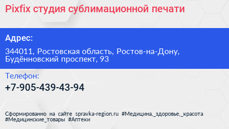 Pixfix, студия сублимационной печати по адресу 344011, Ростовская область, Ростов-на-Дону, Будённовский проспект, 93 в дальнейшем Организация, размещена в следующих категориях: