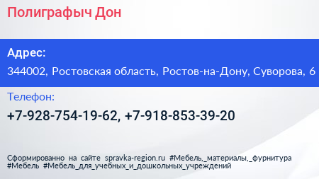 Полиграфыч-Дон по адресу 344002, Ростовская область, Ростов-на-Дону, Суворова, 6 в дальнейшем Организация, размещена в следующих категориях:
