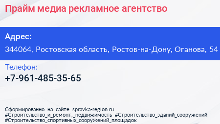 Прайм-медиа, рекламное агентство по адресу 344064, Ростовская область, Ростов-на-Дону, Оганова, 54 в дальнейшем Организация, размещена в следующих категориях: