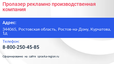 Пролазер, рекламно-производственная компания по адресу 344065, Ростовская область, Ростов-на-Дону, Курчатова, 1д в дальнейшем Организация, размещена в следующих категориях: