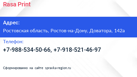 Rasa Print по адресу Ростовская область, Ростов-на-Дону, Доватора, 142а в дальнейшем Организация, размещена в следующих категориях: