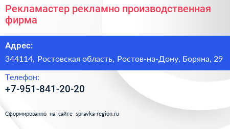 Рекламастер, рекламно-производственная фирма по адресу 344114, Ростовская область, Ростов-на-Дону, Боряна, 29 в дальнейшем Организация, размещена в следующих категориях: