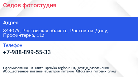 Седов, фотостудия по адресу 344079, Ростовская область, Ростов-на-Дону, Профинтерна, 11а в дальнейшем Организация, размещена в следующих категориях: