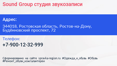 Sound Group, студия звукозаписи по адресу 344018, Ростовская область, Ростов-на-Дону, Будённовский проспект, 72 в дальнейшем Организация, размещена в следующих категориях: