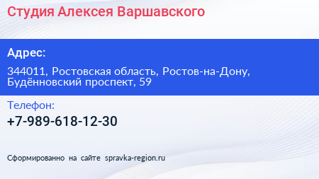 Студия Алексея Варшавского по адресу 344011, Ростовская область, Ростов-на-Дону, Будённовский проспект, 59 в дальнейшем Организация, размещена в следующих категориях:
