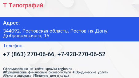 Т-Типографий по адресу 344092, Ростовская область, Ростов-на-Дону, Добровольского, 19 в дальнейшем Организация, размещена в следующих категориях: