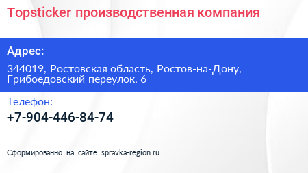 Topsticker, производственная компания по адресу 344019, Ростовская область, Ростов-на-Дону, Грибоедовский переулок, 6 в дальнейшем Организация, размещена в следующих категориях: