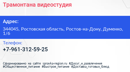 Трамонтана, видеостудия по адресу 344045, Ростовская область, Ростов-на-Дону, Думенко, 1/6 в дальнейшем Организация, размещена в следующих категориях: