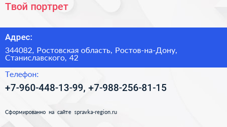 Твой портрет по адресу 344082, Ростовская область, Ростов-на-Дону, Станиславского, 42 в дальнейшем Организация, размещена в следующих категориях: