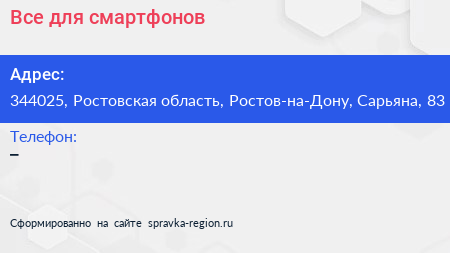 Все для смартфонов по адресу 344025, Ростовская область, Ростов-на-Дону, Сарьяна, 83 в дальнейшем Организация, размещена в следующих категориях: