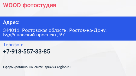 WOOD, фотостудия по адресу 344011, Ростовская область, Ростов-на-Дону, Будённовский проспект, 97 в дальнейшем Организация, размещена в следующих категориях: