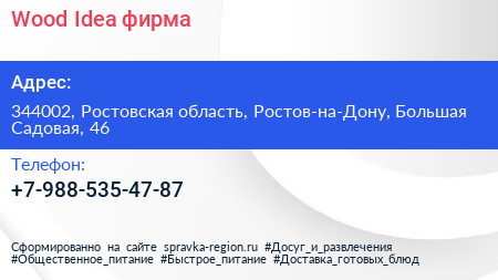 Wood Idea, фирма по адресу 344002, Ростовская область, Ростов-на-Дону, Большая Садовая, 46 в дальнейшем Организация, размещена в следующих категориях: