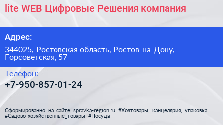 lite:WEB Цифровые Решения, компания по адресу 344025, Ростовская область, Ростов-на-Дону, Горсоветская, 57 в дальнейшем Организация, размещена в следующих категориях: