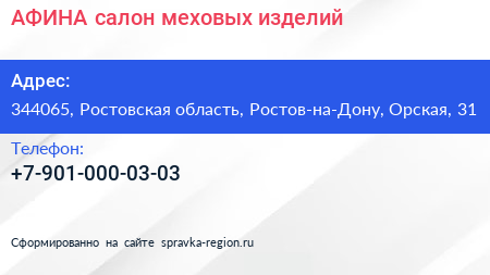 АФИНА, салон меховых изделий по адресу 344065, Ростовская область, Ростов-на-Дону, Орская, 31 в дальнейшем Организация, размещена в следующих категориях: