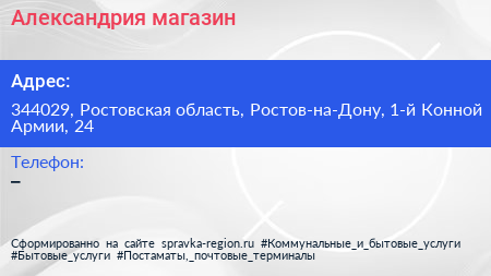 Александрия, магазин по адресу 344029, Ростовская область, Ростов-на-Дону, 1-й Конной Армии, 24 в дальнейшем Организация, размещена в следующих категориях:
