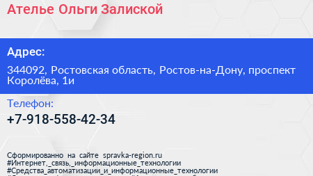 Ателье Ольги Залиской по адресу 344092, Ростовская область, Ростов-на-Дону, проспект Королёва, 1и в дальнейшем Организация, размещена в следующих категориях: