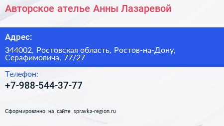 Авторское ателье Анны Лазаревой по адресу 344002, Ростовская область, Ростов-на-Дону, Серафимовича, 77/27 в дальнейшем Организация, размещена в следующих категориях: