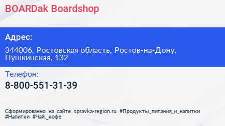 BOARDak Boardshop по адресу 344006, Ростовская область, Ростов-на-Дону, Пушкинская, 132 в дальнейшем Организация, размещена в следующих категориях: