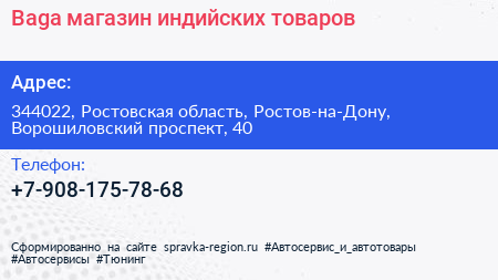 Baga, магазин индийских товаров по адресу 344022, Ростовская область, Ростов-на-Дону, Ворошиловский проспект, 40 в дальнейшем Организация, размещена в следующих категориях: