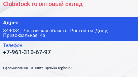 Clubstock.ru, оптовый склад по адресу 344034, Ростовская область, Ростов-на-Дону, Привокзальная, 4а в дальнейшем Организация, размещена в следующих категориях: