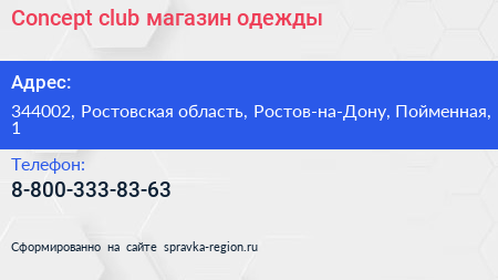 Concept club, магазин одежды по адресу 344002, Ростовская область, Ростов-на-Дону, Пойменная, 1 в дальнейшем Организация, размещена в следующих категориях: