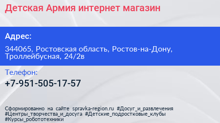 Детская Армия, интернет-магазин по адресу 344065, Ростовская область, Ростов-на-Дону, Троллейбусная, 24/2в в дальнейшем Организация, размещена в следующих категориях: