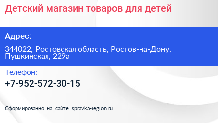 Детский, магазин товаров для детей по адресу 344022, Ростовская область, Ростов-на-Дону, Пушкинская, 229а в дальнейшем Организация, размещена в следующих категориях: