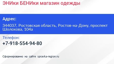 ЭНИки-БЕНИки, магазин одежды по адресу 344037, Ростовская область, Ростов-на-Дону, проспект Шолохова, 104а в дальнейшем Организация, размещена в следующих категориях: