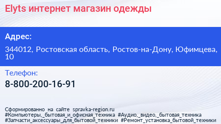 Elyts, интернет-магазин одежды по адресу 344012, Ростовская область, Ростов-на-Дону, Юфимцева, 10 в дальнейшем Организация, размещена в следующих категориях: