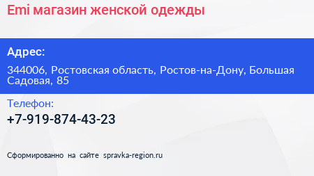 Emi, магазин женской одежды по адресу 344006, Ростовская область, Ростов-на-Дону, Большая Садовая, 85 в дальнейшем Организация, размещена в следующих категориях: